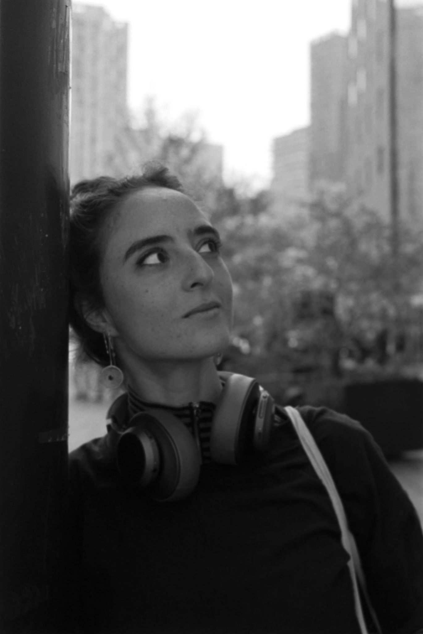 Portrait of a woman in b&w film 35mm with flash on camera.