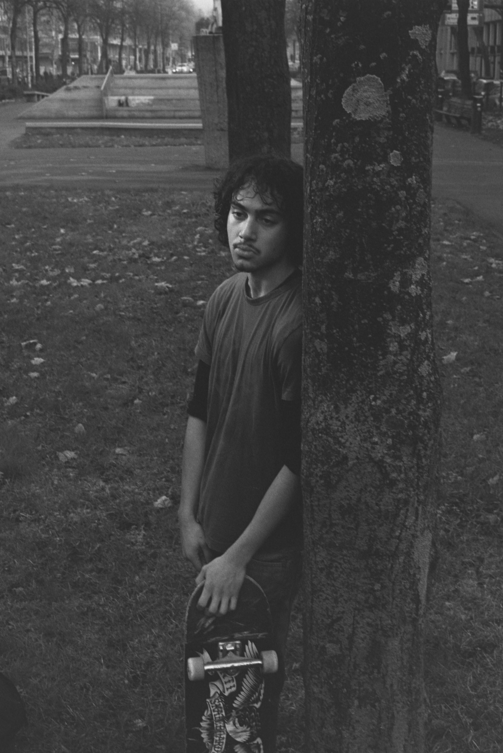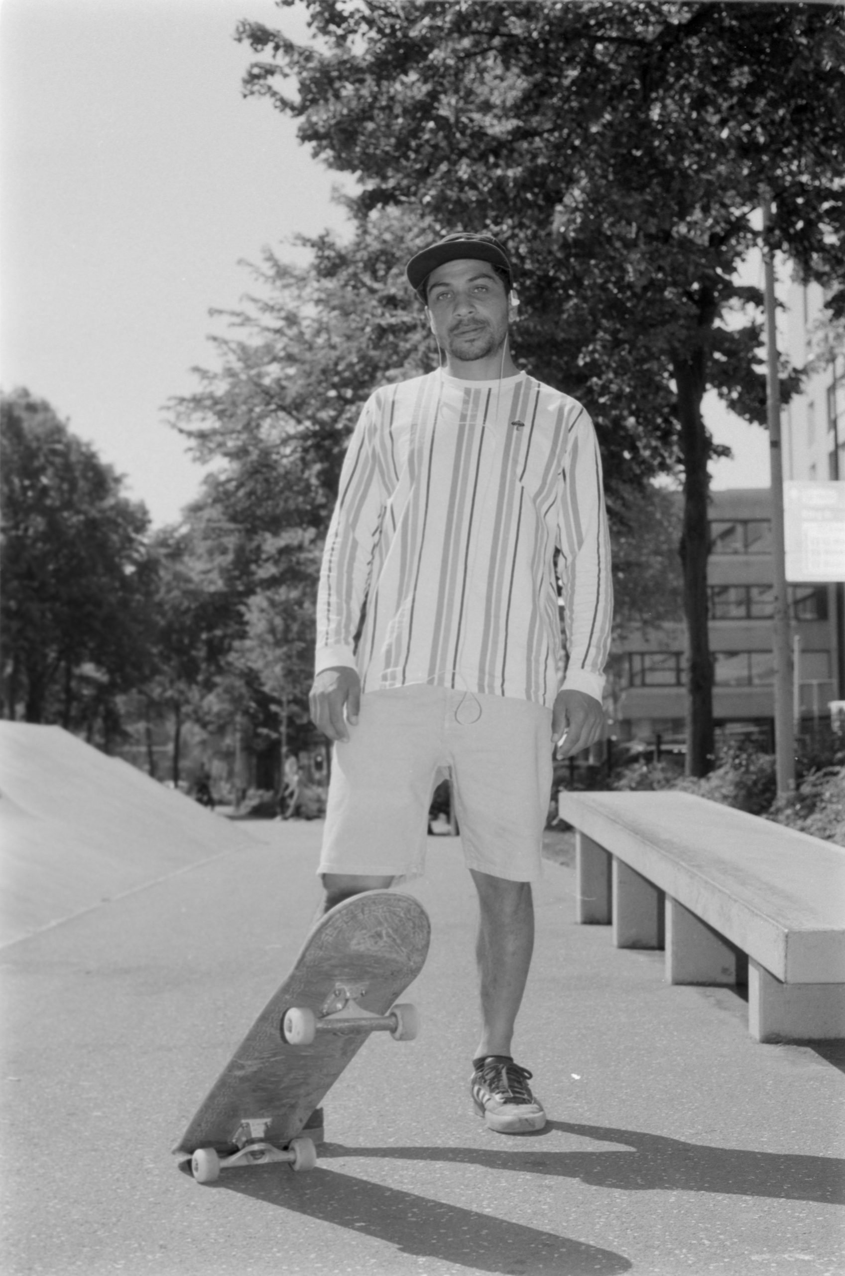Man posing at the skatepark in Rotterdam with his skateboard, photo was taken on 35mm black and white film trix400 with flash.
