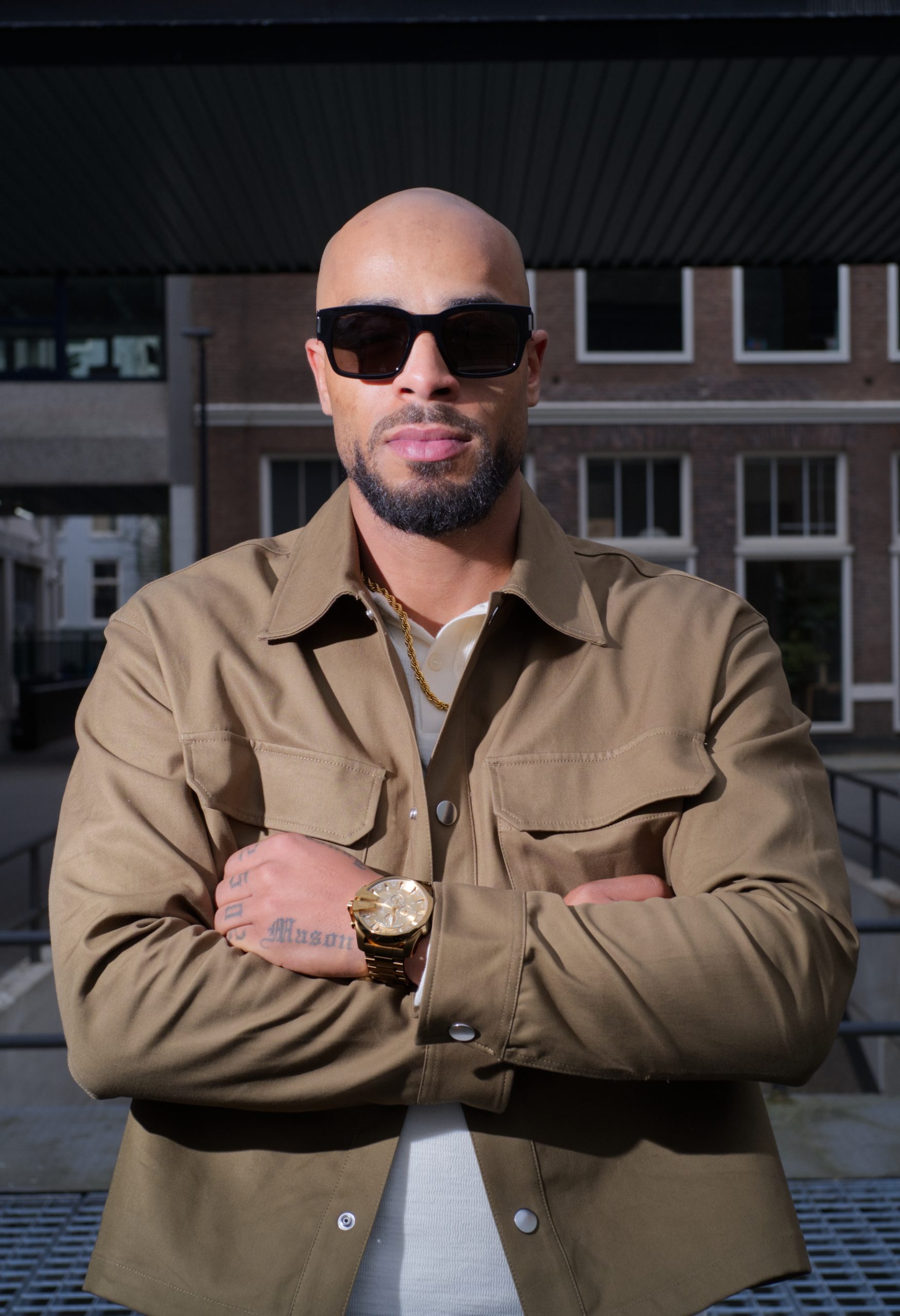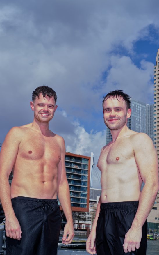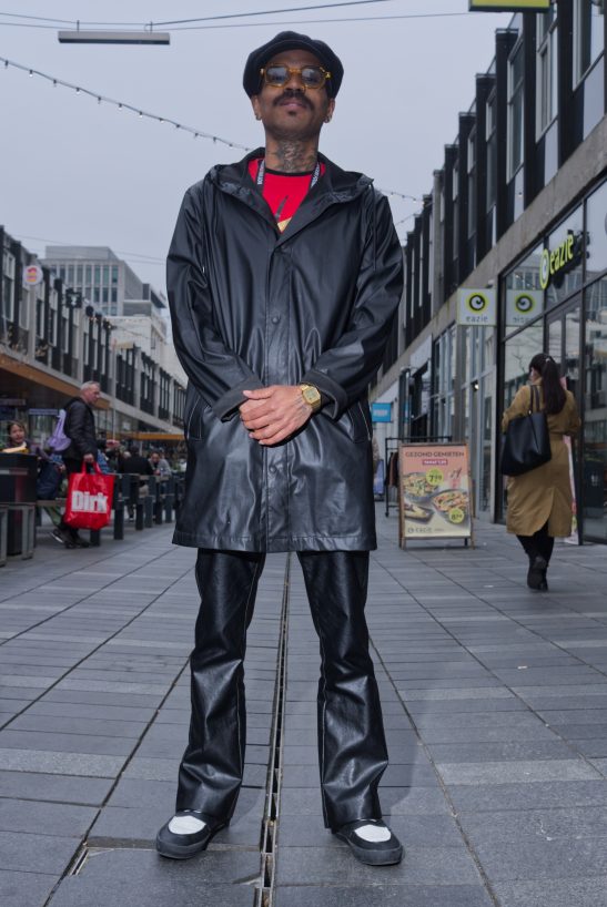 This image shows a portrait of a man in fashion clothing taken in Rotterdam.