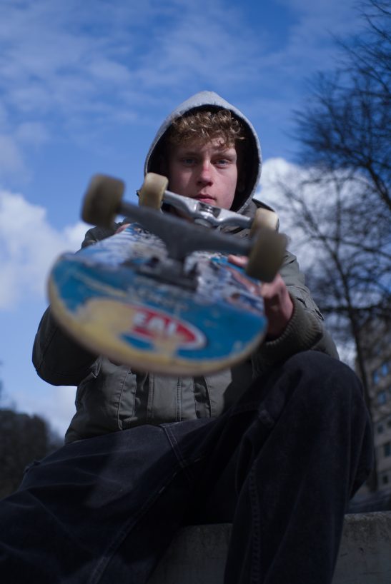 Here you see a portrait of a skater insta: q_robinson1.3 posing in front of a fuji gfx50s 63mm off camera flash.